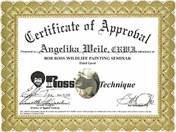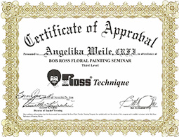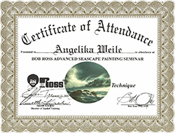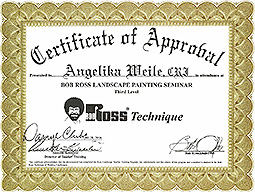 Meine Ausbildung zum Bob Ross Mallehrer absolvierte ich in Holland bei den amerikanischen Lehrern Ellen Tye, die noch von Bob Ross selbst unterrichtet wurde, Mary Mc.Lead, Darryl Clubb und Bernard Oropallo. Ich erhielt Zertifikate in der Landschafts-, Blumen-, Meeres- und Tiermalerei, weitere folgten. Inzwischen absolvierte ich in Berlin auch alle Stufen der Gary Jenkins Malausbildung, die ebenfalls auf der Nass-in-Nass Ölmaltechnik beruht und sich überwiegend mit der Blumenmalerei beschäftigt.